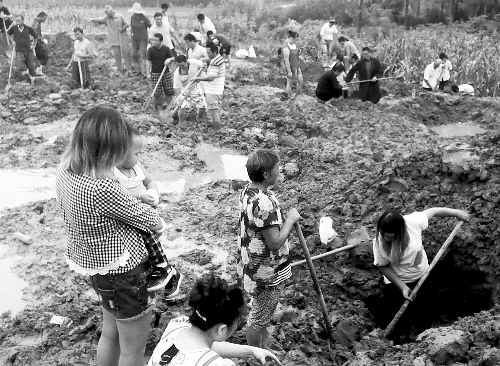 “小孩别在上面站,别把土踩塌了。”几名村民一边拿着铁锹在土方上开挖,一边呵斥站在土方上玩耍的小孩。旁边是大大小小的土坑,最深的有4米左右,大土堆中间已经被挖出一个20平方米左右的土坑,由于刚下过雨,里面积满了水,变成了一池泥浆。现场每个人都挽起袖子、裤管,在没有积水的地方仔细寻找,泥浆沾满全身。
