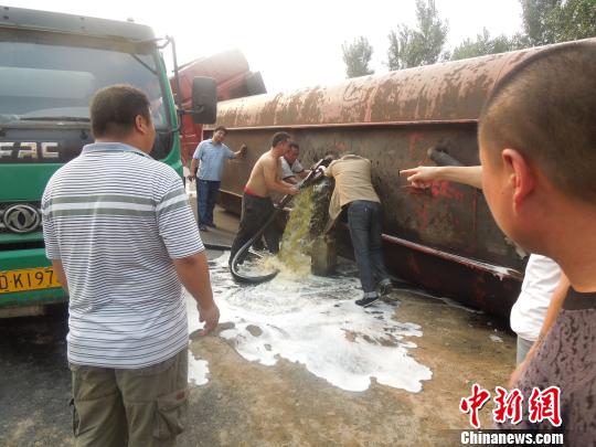 图为被掀翻的油罐车邯郸消防摄