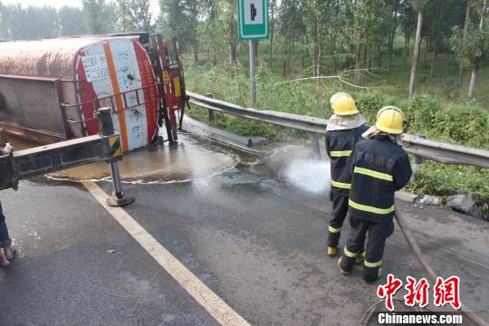 中新网邯郸9月11日电(马继前)河北邯郸消防支队11日通报称,10日,该市消防官兵成功处置一起因两车剐蹭,造成装有大量柴油货车侧翻的交通事故。因处置及时,该事故未造成柴油大量泄漏,未造成人员伤亡。