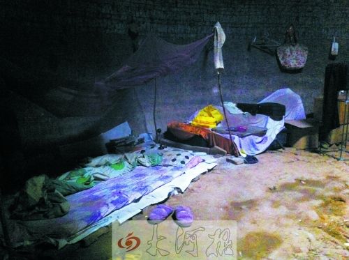 弯腰进入砖窑,里面昏暗无比,模糊的光亮来自砖窑顶一个直径约1米的豁口。豁口上盖着一块铁丝网,以防异物掉落。紧靠西侧洞壁下,是一处地铺,支着一顶旧蚊帐,支蚊帐的木棍上,挂着一些旧衣服。地铺旁边,堆着一些杂物,上面落满灰尘。正对砖窑口的洞壁下,摆着几张捡来的小木桌和方凳,木桌上放着半根蜡烛。东侧地面上,摆着洗净的锅碗瓢盆……