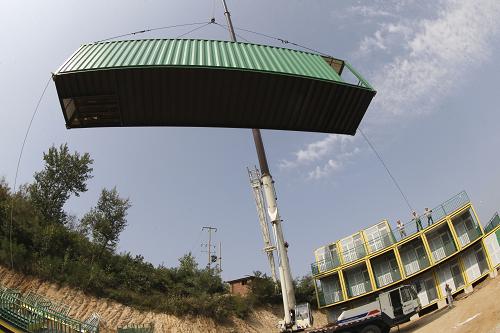 (9月14日,在烟台市莱山区朱雀山生态旅游度假区,施工人员在吊装集装箱。新华社发(申吉忠 摄))