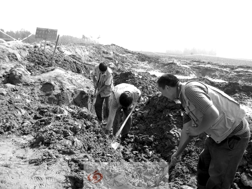 泥土堆,是挖掘机开挖沟渠时挖出、抛在沟渠旁的新鲜泥土,沟渠旁堆了两三米厚。文物清理人员手持铲子,每次小心翼翼地铲土不到一厘米厚,然后轻轻地倒在一旁,仔细翻找后再铲第二铲。