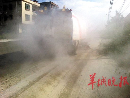 洒水车开过,激起粉尘 羊城晚报 记者 李永摄
