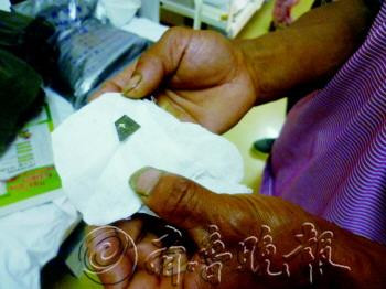 术取出卡在男孩食道内的刀片棱角很锋利。本报记者 宋佳 摄