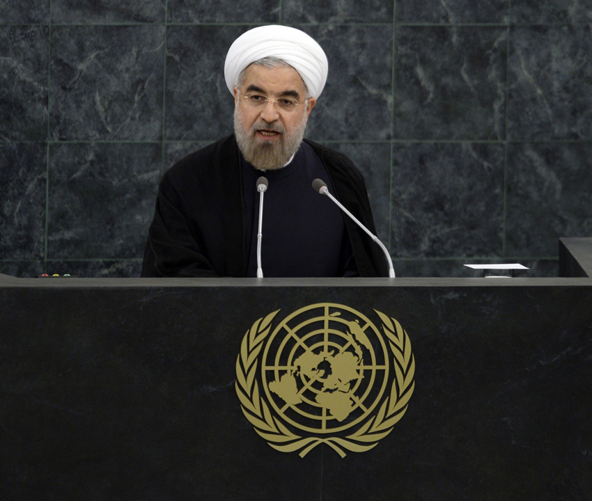 9月24日,伊朗总统鲁哈尼在纽约联合国总部举行的第68届联合国大会一般性辩论中发言。第68届联大一般性辩论当天拉开帷幕。联合国193个会员国以及观察员国、观察员实体和部分观察员组织的代表齐聚联合国总部,各自阐述对当前紧迫的全球性问题的看法。新华社/法新