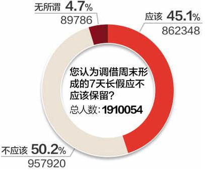 为反映公众意愿,使放假安排更加科学合理,这份由全国假日办发布的“关于法定节假日放假安排的调查问卷”共设有六个问题,其中主要涉及对现行的法定节假日放假安排是否满意,认为调借周末形成七天长假应不应该保留,认为有无必要一天的节日调借周末形成三天小长假,三方面的问题。那么这份调查究竟会征集到什么样的民意?在参与调查人数最多的凤凰网,截止到今天晚上六点,点击投票的网友已经超过122万,而对于“您对现行的法定节假日放假安排是否满意”的问题,66.9%的人表示不满意,同样的问题在有近15万人参与调查的新浪网表示不满意的比例达82%。
