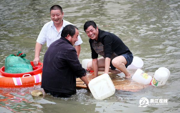 突如其来的灾难面前,浙江群众没有畏惧,全省上下携手互助,从容应对,迅速开展生产自救,即便是家园受淹、出行受困,依然能看到一个又一个笑容。