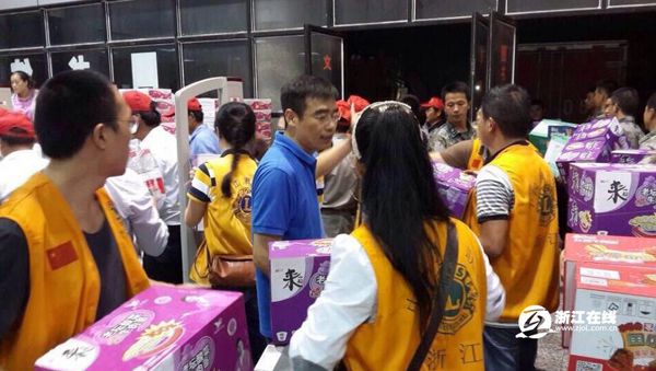 民间组织狮子会第一时间募集物资,送到余姚受困群众手中。