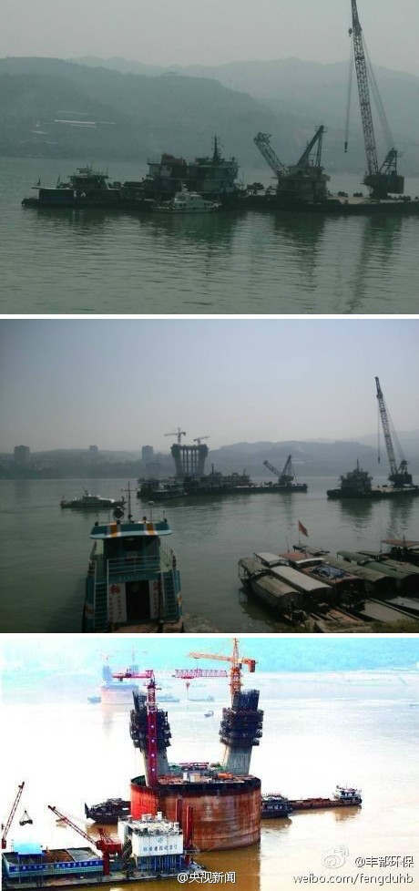 #央视快讯#【在建的重庆丰都长江二桥发生垮塌 多名工人下落不明】今天上午11点左右,正在施工的丰都长江二桥发生垮塌事故,2号墩全部沉入水中,正在作业多名工人下落不明。现场图片中,作业船上的塔吊已经折断,工作船所在水域已经看不到桥墩的痕迹。目前海事、消防等部门正在搜索救援。(央视记者唐巍)