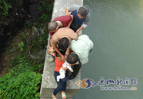 昨(11)日下午2时43分许,四川省乐山市中区棉竹高坝燕坝电站旁的大桥下发生了惊险一幕:一名年轻女子抱着约1岁的儿子坐在桥下河边的石墩上,欲跳河轻生。所幸家人和消防官兵及时赶至处理,才避免了悲剧发生。