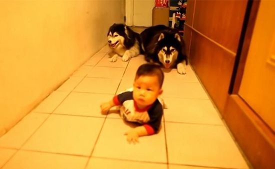 视频中,一名婴儿在公寓的走廊里学习爬行,两只哈士奇犬耐心地坐在后面守候。突然,两只狗狗也趴在了地上,模仿婴儿的每一个动作,并最终追上了婴儿。