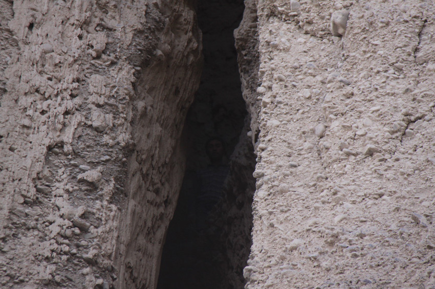这面悬崖的中间两条裂缝即是被困男子被困处。 艾则孜江 摄