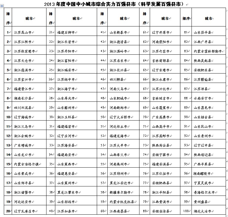 中国网10月21日讯 《2013年中国中小城市绿皮书》21日在京发布,绿皮书发布了2013年度中国中小城市综合实力百强县市,并指出,2013年中小城市科学发展指数上升至68.9,昆山市连续九年荣膺全国百强县市第一名。