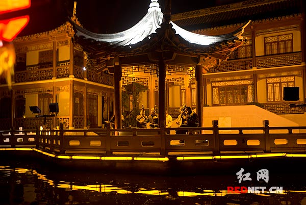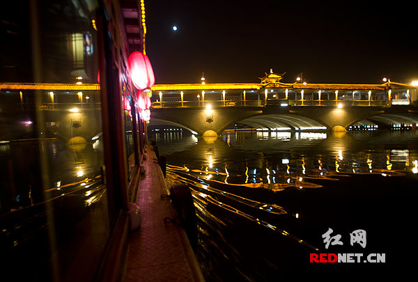 (被彩灯映照的亭台楼阁连绵于凤城河两岸,引人入胜。)