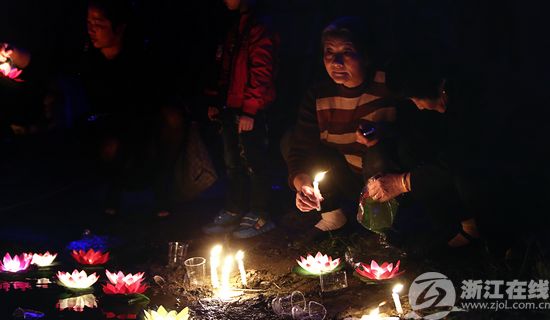 夜幕降临,一束束点燃的烛光,一盏盏漂过的莲花灯,还有放飞空中的天灯,都在默默地寄托着哀思。