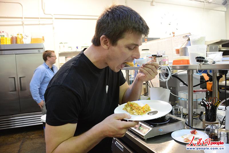 Hampton Creek公司创办人乔希-泰特里克正在品尝由人造鸡蛋烹饪的蛋炒饭