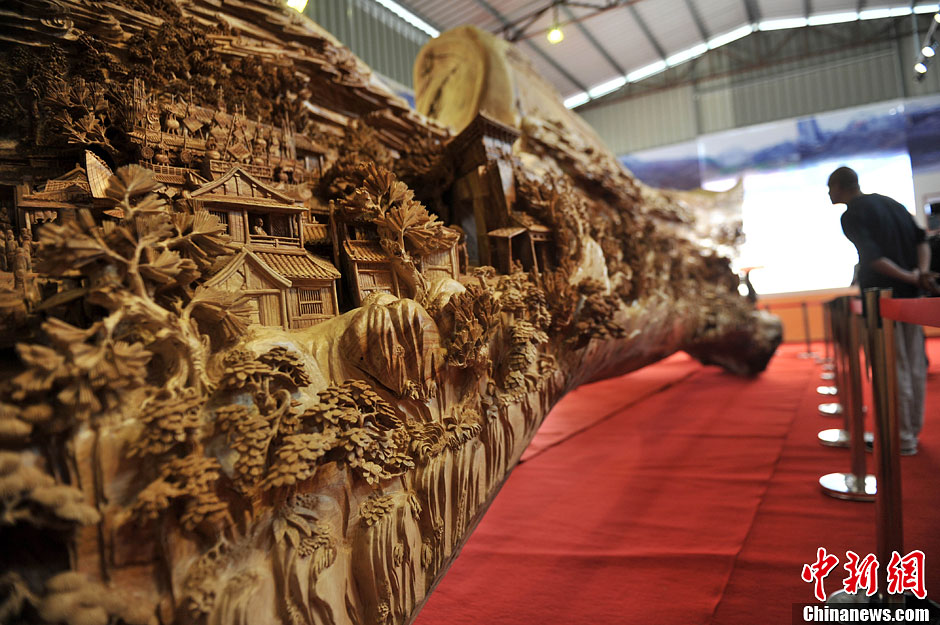 郑春辉的木雕《清明上河图》长12.286米,高3.075米,宽2.401米。作品采用镂空雕、透雕、浮雕和莆田精微透雕等雕刻技法创作,画面中人物,景物惟妙惟肖,立体感强,层次分明,雕工精致。图为民众在参观木雕《清明上河图》。吕明摄