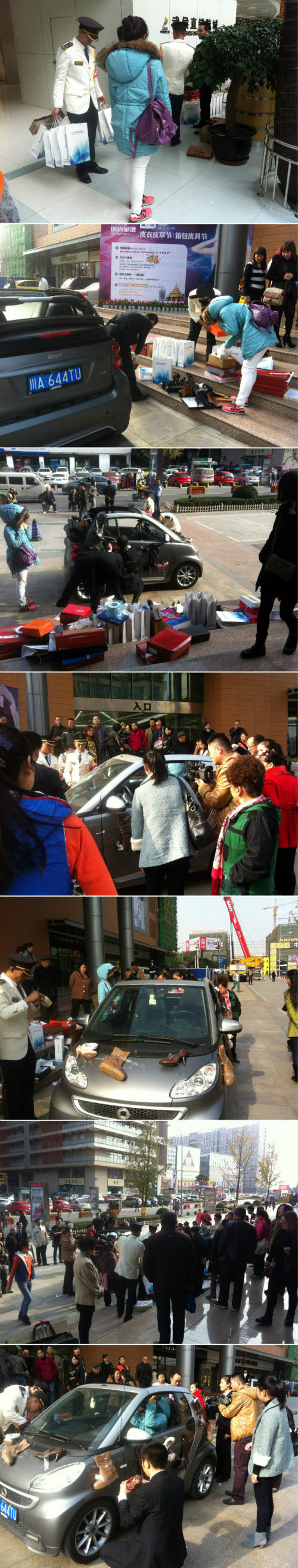 15日下午,网友“弼然星动”发微博称,逛武侯直销鞋城时,看一美女买了近百双鞋。“我当时没多想,谁叫人家有钱呢,结果,她开的那辆smart装不下所有鞋,只好让工作人员用胶带全部粘到了车外面!”