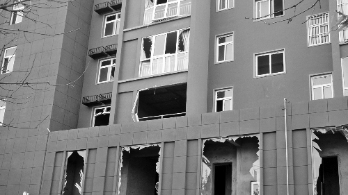 透过已经被炸毁的阳台记者看到,发生爆炸的房子还是毛坯墙,并未进行装修,也尚未有人入住。因为发生事故的是临街楼,小区外的楼前拉着警戒线,路边停有维持秩序的警车。
