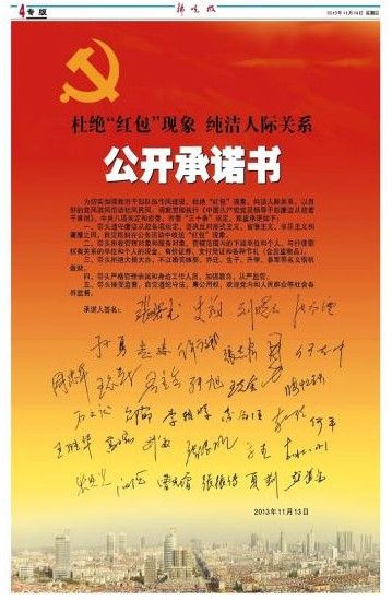 记者看到,当天《拂晓报》用4版整版刊登公开承诺书,书记和市长带头签字。承诺书提到,为切实加强干部队伍作风建设,杜绝红包现象,纯洁人际关系,以良好的党风政风带动社风民风,就贯彻执行中央及安徽省相关规定郑重承诺。