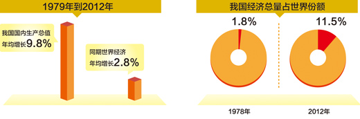 经济总量连上台阶,是因为我们的增长速度创造了奇迹。从1979年到2012年,我国国内生产总值年均增长9.8%,同期世界经济年均增速只有2.8%。中国的经济总量居世界位次稳步提升,对世界经济增长的贡献不断提高。1978年,我国经济总量仅位居世界第十位;2008年超过德国,居世界第三位;2010年超过日本,居世界第二位,成为仅次于美国的世界第二大经济体。经济总量占世界的份额由1978年的1.8%提高到2012年的11.5%。2008年下半年国际金融危机爆发以来,我国成为带动世界经济复苏的重要引擎,2008—2012年对世界经济增长的年均贡献率超过20%。