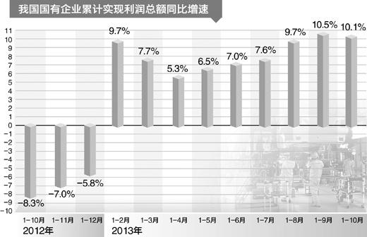 随着我国经济持续回暖,今年二季度以来,全国国有企业利润增幅逐月扩大:1—4月利润同比增长5.3%,1—5月利润同比增长6.5%,1—6月利润同比增长7%,但仍略低于经济增长速度。下半年,国有企业实现利润增幅明显扩大,1—8月同比增长9.7%,1—9月同比增长10.5%,1—10月利润增幅仍保持在10%以上。
