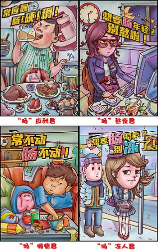 肠道可以说是人体健康的“晴雨表”。不知从何时起,面临各种肠道问题而不知所措的人越来越多,逐渐形成时下一个无奈的群体——“肠囧族”,而冬季岁末的到来也让“肠囧族”们面临新的挑战。“肠应酬君”每天遭遇酒肉饭局、“肠熬夜君”年末熬夜赶报告、“肠懒惰君”天儿冷就宅着和“肠冻人君”冷也要性感,这四个听上去有趣又新鲜的名词活灵活现的描绘了“肠囧族”的冬日窘境。
