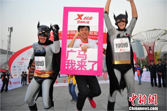 2013广州马拉松比赛23日开赛,伦敦奥运冠军陈定在开赛前与身着“蝙蝠侠”服饰的跑友合影。 卢汉欣 摄