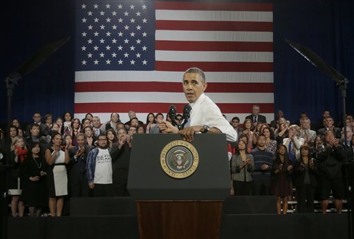 (11月25日,美国旧金山,总统奥巴马在邓月薇华人康乐中心发表讲话,阐述有关移民法案的理念。在发表讲话的过程中,一位名为Ju Hong的韩国人打断奥巴马的讲话,当众责问奥巴马有关驱逐出境的问题。奥巴马中断了自己的讲话,并转身倾听和回答这名男子的问题。 )