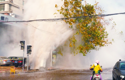 本报讯昨天上午10时许,郑州市紫荆山路与顺河路交叉口西北角一处热力管道发生爆裂,水柱及蒸汽烟雾喷出几十米高,多辆汽车被坠落碎石砸中,所幸无人受伤。约一小时后,爆裂点被控制,热力公司初步判断为管网老化引起,周围约20万平方米用户供热受到影响。