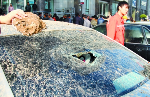 现场,爆裂点附近沥青地面被水柱冲开,周围散落着坠落的碎石,多辆停靠路边的汽车玻璃被砸穿,还有一些车辆进水,所幸当时车内均无人。
