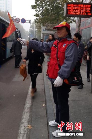 连续六天的雾霾天气,使古都南京笼罩在一团灰黄色的空气中。南京市中小学于12月5日全部停课,孕妇也纷纷请了“雾霾假”。但在南京市街头,仍然有这样一群工作者坚守在工作岗位,他们是环卫工人、交警、快递员…… 图为志愿者大妈在公交站指挥公交停靠。齐书懿 摄