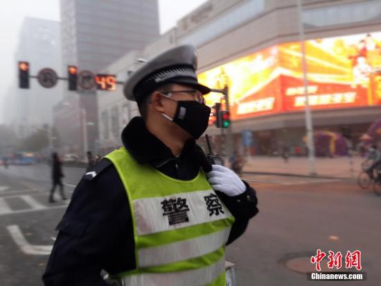 连续六天的雾霾天气,使古都南京笼罩在一团灰黄色的空气中。南京市中小学于12月5日全部停课,孕妇也纷纷请了“雾霾假”。但在南京市街头,仍然有这样一群工作者坚守在工作岗位,他们是环卫工人、交警、快递员…… 图为交警戴上口罩在马路上执勤。齐书懿 摄