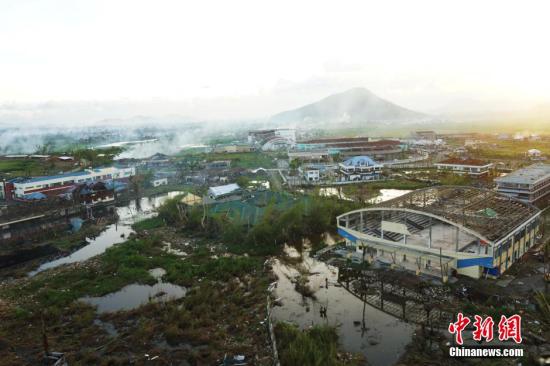 12月8日,中国海军和平方舟医院船舰载直升机赴菲律宾重灾区塔克洛班回访。图为从直升机上拍摄的灾区全景。中新社发 王曦 摄