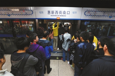 地铁10号线惠新西街南口站乘客挤成一团摄影/《法制晚报》记者 林晖