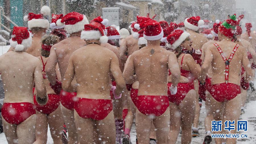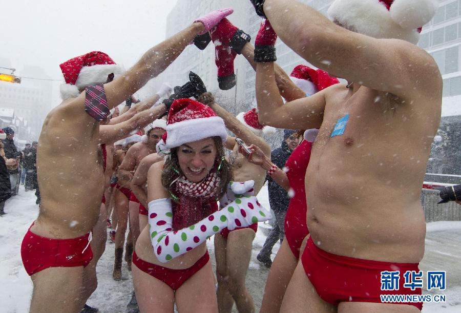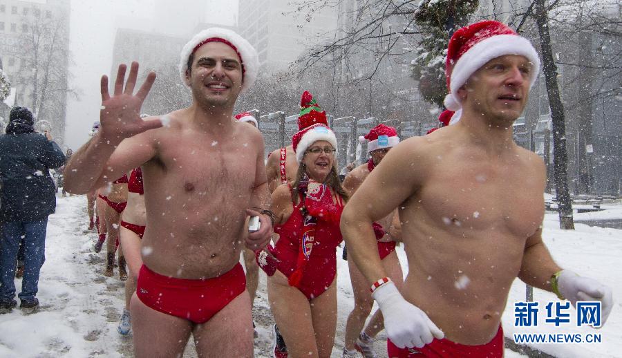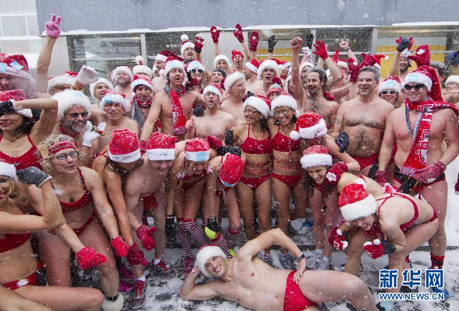 新华社照片,多伦多,2013年12月15日 (国际)(3)圣诞泳装跑 他们不怕冷 12月14日,在加拿大多伦多,参与者冒雪参加“圣诞泳装跑”活动。当日,加拿大多伦多举行2013年“圣诞泳装跑”活动,数十位身着红色泳装、头戴圣诞老人帽的参与者顶风冒雪完成了近3公里慢跑,为当地患病儿童募集捐款。新华社发(邹峥摄)