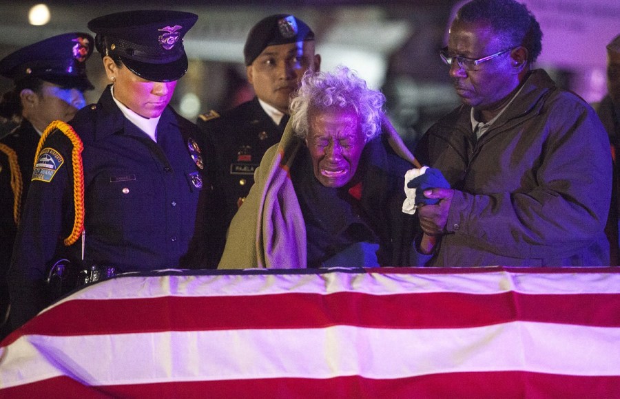 当地时间2013年12月21日,在朝鲜战争牺牲的美国陆军中士约瑟夫·甘特遗体回国,其现年94岁的妻子在机场泪目迎接。