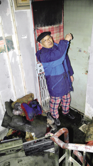 昨天9:40左右,家住乌江北里4楼的宋大爷家突然起火。记者赶到现场时,楼栋门前和楼道内的积水已经结冰,宋大爷家的邻居和亲属正在收拾“残局”,门口堆放着烧坏的被褥、枕头、收音机等,屋内房顶几乎都被熏黑。