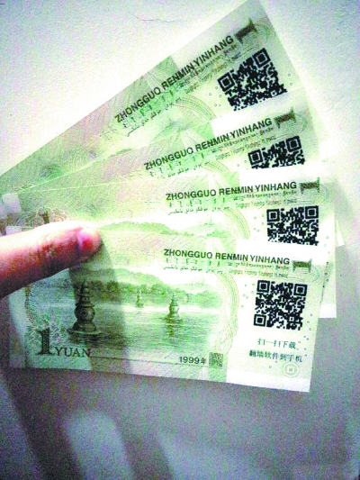 本报讯(记者张全录)9日,市民吴女士在汉口西马路一超市购物,超市收银员找零时给了她4张带有二维码的一元纸币(右图)。“纸币上也有二维码?”吴女士感觉新鲜又纳闷,于是发微博报料。