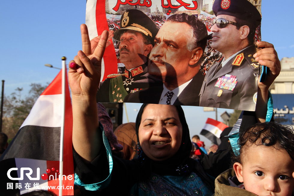 一名埃及妇女高举印有塞西和前总统纳赛尔、萨达特画像的海报。摄影:张一夫