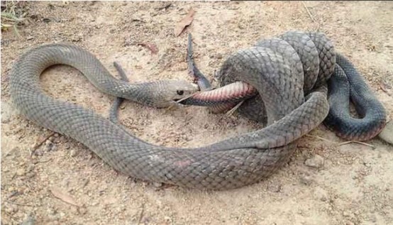 据黄金溪堪培拉爬行动物公园(Gold Creek Canberra Reptile Zoo)的负责人沛泽拉(Antony Pezzella)表示,蛇吃蛇的现场并非不常见,尽管蛇类更喜欢吃哺乳类动物。“多数澳大利亚蛇类在有机会的情况下会吃掉其他爬行动物。”沛泽拉说。“一般来说,红腹黑蛇更有肯能吃掉棕蛇。但如果棕蛇体型较大,棕蛇也会吃掉红腹黑蛇。”