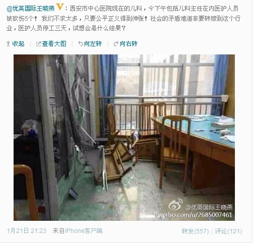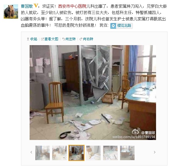 西部网讯 今天(1月22日)凌晨,有微博爆料称,“西安市中心医院发生一起医患冲突事件,患者家属闯入中心医院儿科办公室,持斧头将多名医生及处警民警砍伤。”今天上午,记者采访西安市公安局新城分局证实,昨天(1月21日)下午,西安市中心医院儿科确实发生一起医患冲突事件,导致4名医护人员及2名处警民警受伤,伤情较轻。