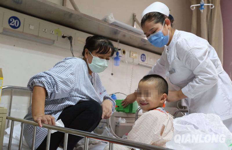 他也是孙琳护理的孩子,看到记者拍照,小男孩有点紧张。妈妈对他说:“看,给你和孙琳姐姐拍留影呢。”小男孩开心的笑了(11月6日摄)。千龙网记者 张启新摄