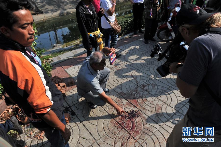 1月28日,在位于泰国首都曼谷的陆军俱乐部附近的街道上,一名反政府人士在枪击现场展示血迹。