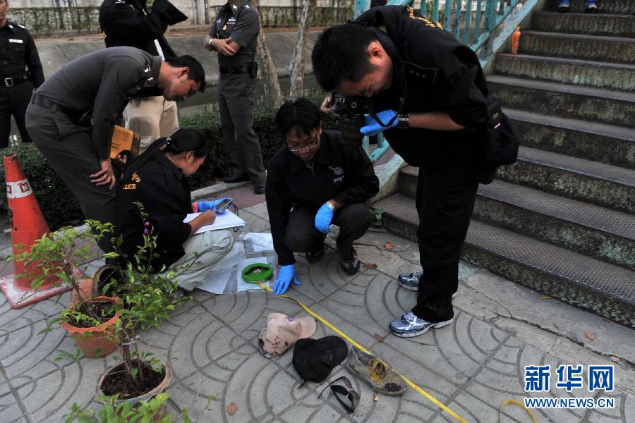 1月28日,在位于泰国首都曼谷的陆军俱乐部附近的街道上,泰国警方勘察枪击现场。
