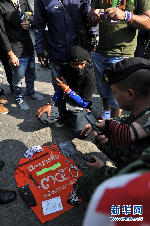 1月28日,在位于泰国首都曼谷的陆军俱乐部附近的街道上,一名反政府人士向军方展示枪击物证。