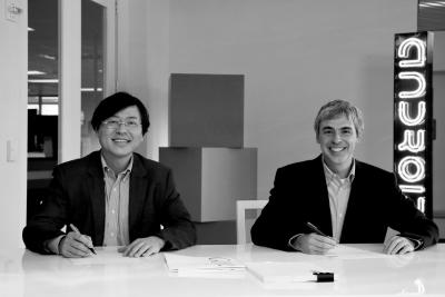杨元庆与谷歌CEO拉里佩奇(右)在签署并购协议。联想供图
