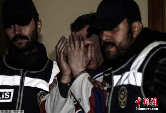 当地时间2月7日,一名乌克兰人企图劫持一架载有110名乘客的土耳其民航班机到正在举办冬季奥运会的俄罗斯索契,但最终在土耳其最大城市伊斯坦布尔的萨比哈·格克琴国际机场被制服。图为警察押送企图劫机的男子(右)。(视频截图)