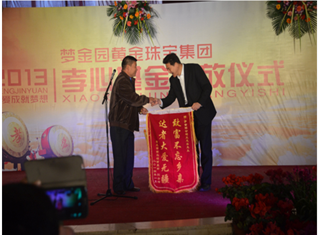 国内著名黄金首饰企业梦金园为倡导爱老、敬老、助老的良好风尚,弘扬中华民族优秀传统文化,推进员工道德建设,让每位员工学会感恩父母、感恩社会,树立新时期孝道理念,2013年始设立孝心基金,孝心基金由两部分组成,一分部是公司为每位员工的父母每月出100元,另一部分由员工每月出100元,年底将基金发放到员工父母手中。