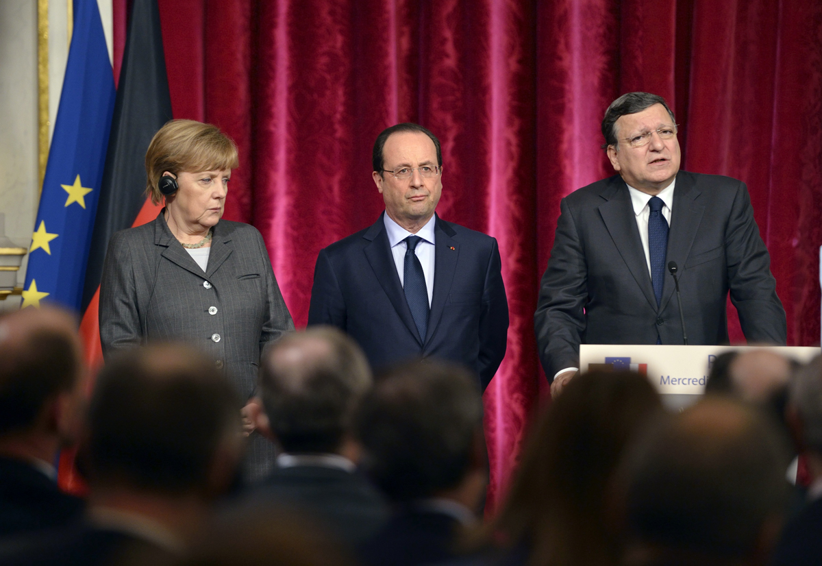 2月19日,法国总统奥朗德(右)和德国总理默克尔(中)在法国巴黎参加法德联合内阁会议后会见媒体。当日,法国总统奥朗德与德国总理默克尔在法国总统府爱丽舍宫共同主持第16次法德联合内阁会议。会议决定在防务、清洁能源、欧洲建设等领域加强合作。新华社记者陈晓伟摄